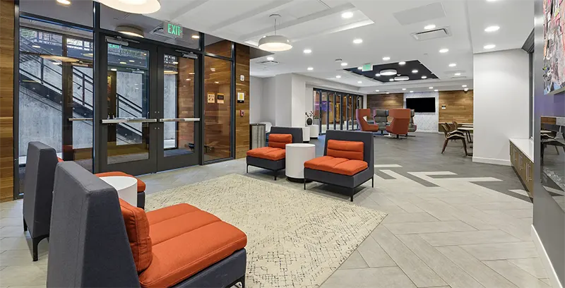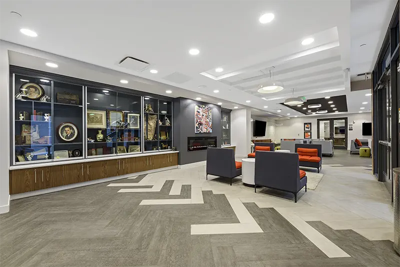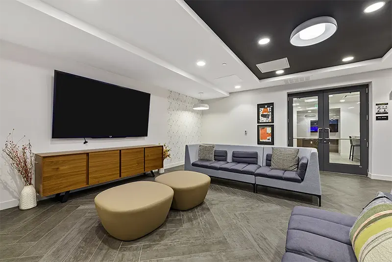 Huddle around the fire for a study session or a game night. Our community lounge space has a variety of areas for you to relax.